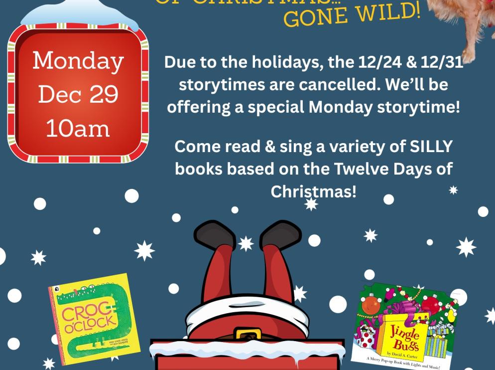 For families: The 12 Days of Christmas have Gone Wild! Join us for a special, fun-filled, musical Storytime. It will be a morning of laughs as we sing along with a variety of silly books based on the classic carol. This interactive session is packed with rhythm, rhymes, and plenty of giggles. It will put a smile on everyone's face!