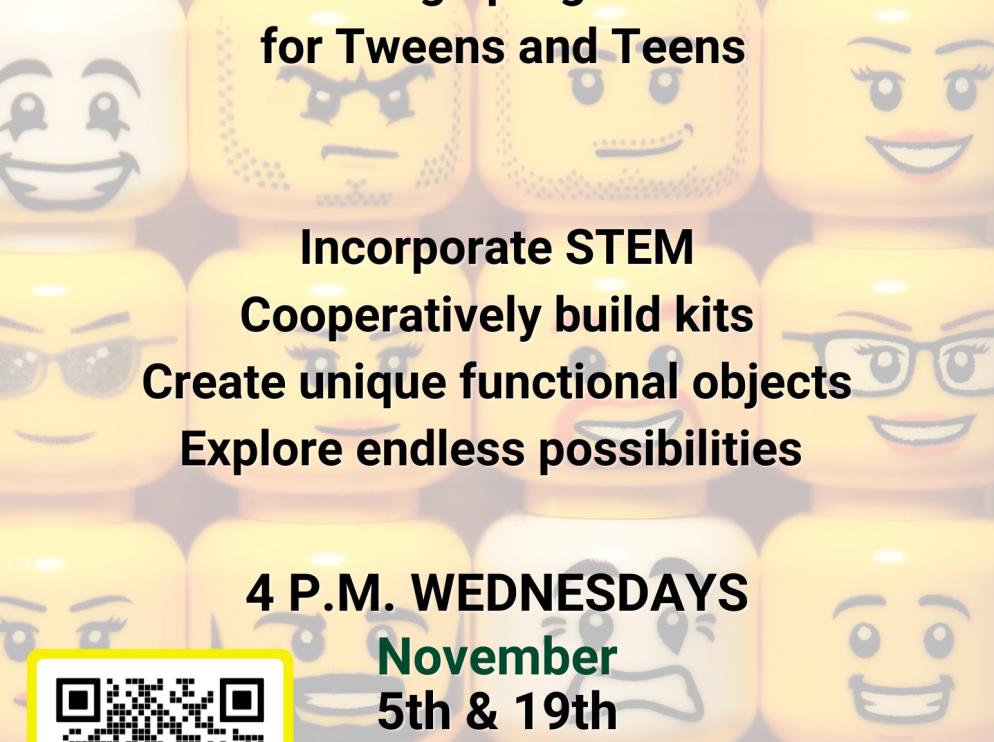 For tweens and teens, 6th - 12th grades: Bring Lego building to the next level! We'll create functional and unique builds, incorporate basic circuitry and coding and even create brickfilms using stop motion animation. Register at https://l.ead.me/bffoY3