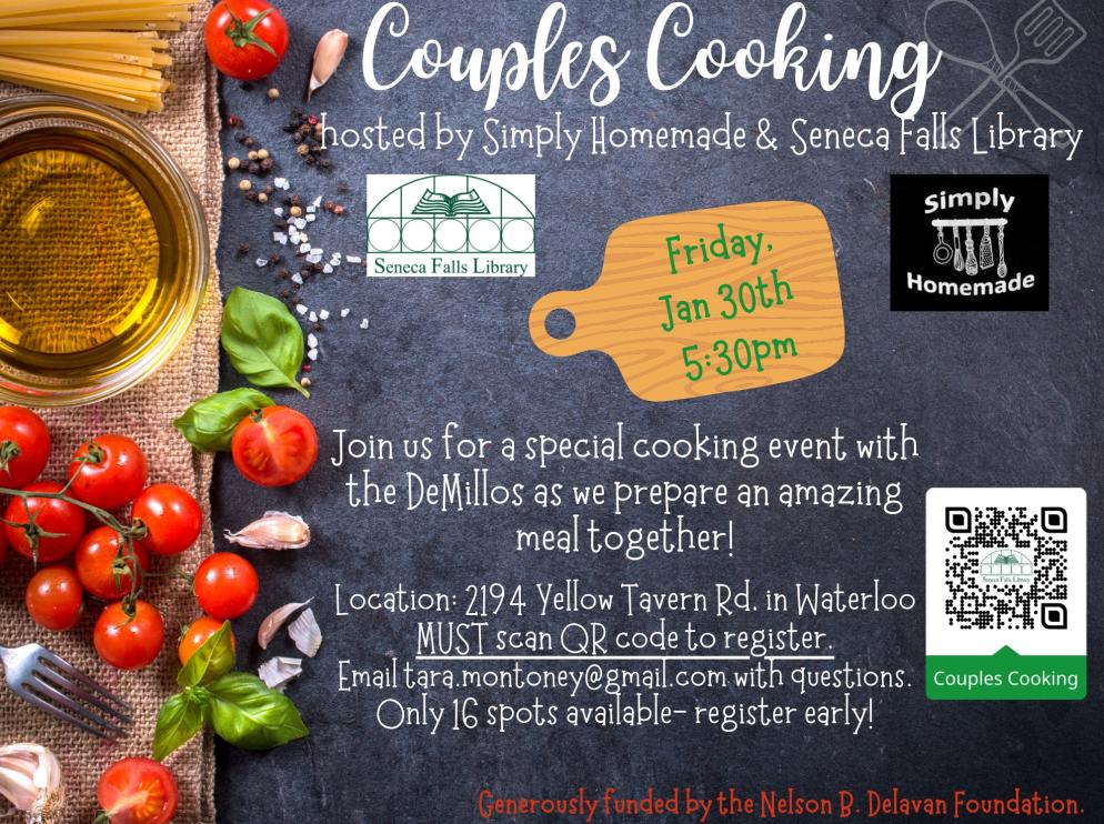 For Adults: Join us for a special cooking event with the DeMillos as we prepare an amazing meal together! This event will take place at Simply Homemade, 2194 Yellow Tavern Road, Waterloo. This event is free and all ingredients are furnished, but you MUST register as only 16 spots are available. Register at https://l.ead.me/bgRL3s . Email tara.montoney@gmail.com with questions.