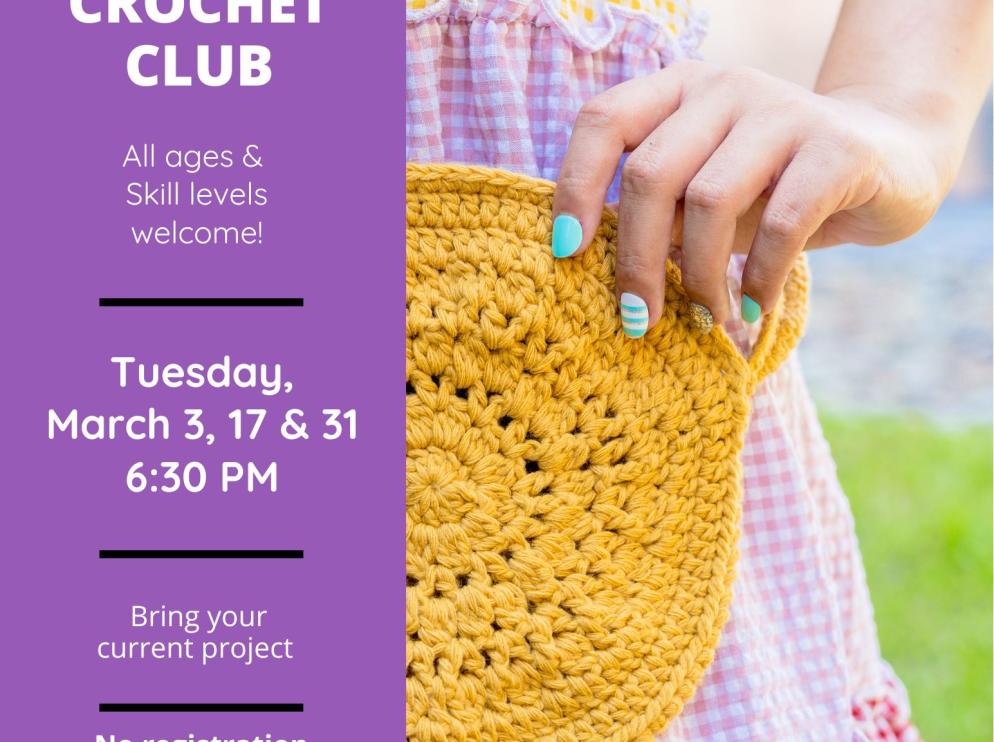 All Ages & Skill Levels Welcome. Have you never crocheted before or have you been crocheting for years? No matter your skill level, drop in to our Crochet Club! Instructor, Laura Jacuzzo will help newbies to learn the basics and veterans with tips and techniques. All ages and experience levels are welcome. Bring your in-progress project or feel free to use needles provided by the instructor. No registration is required!